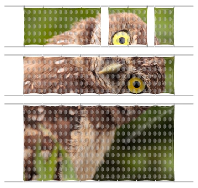 Meshul are microperforații pentru a permite trecerea vântului și a luminii prin material. Având o greutate mai mică decât frontlit banner, îl poate înlocui pe acesta în cazul printurilor de mari dimensiuni, situație în care frontlit banner se poate rupe din cauza propriei greutăți. Este utilizat pentru producția printurilor aplicate pe clădiri, stadioane și pentru alte proiecte ce necesită printuri de mari dimensiuni. Se poate finisa cu: tiv, capse, buzunare pe laturi.